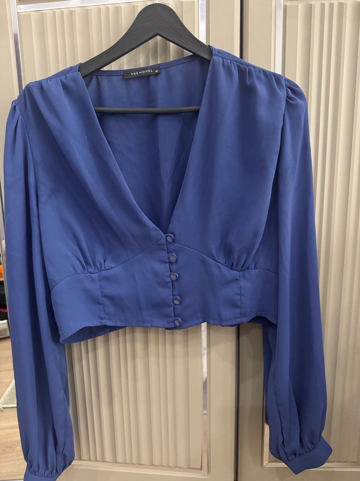 Düğmeli, V yakalı ve uzun kollu bu koyu mavi bluz, ipeksi kumaştan üretilmiş, bol kesim ve midi boydadır. Günlük sokak stili için uygundur. CROP BLUZ , ürünü crop kullanmak istemediğim için 42 beden aldım ama 38 bedenim. 38,40 beden de tercih edebilir