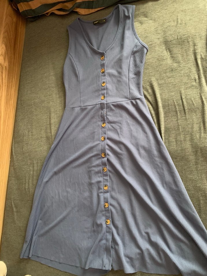 Düğmeli, V yakalı, midi ve kolsuz mavi elbise, vücuda oturan kesime sahiptir. Yumuşak sentetik kumaştan yapılmıştır, günlük kullanıma uygundur. Son fotoğraftaki gibi bir dikiş söküğü vardır arkasında ufak bi dikişlik iştir. 1 kere giydim