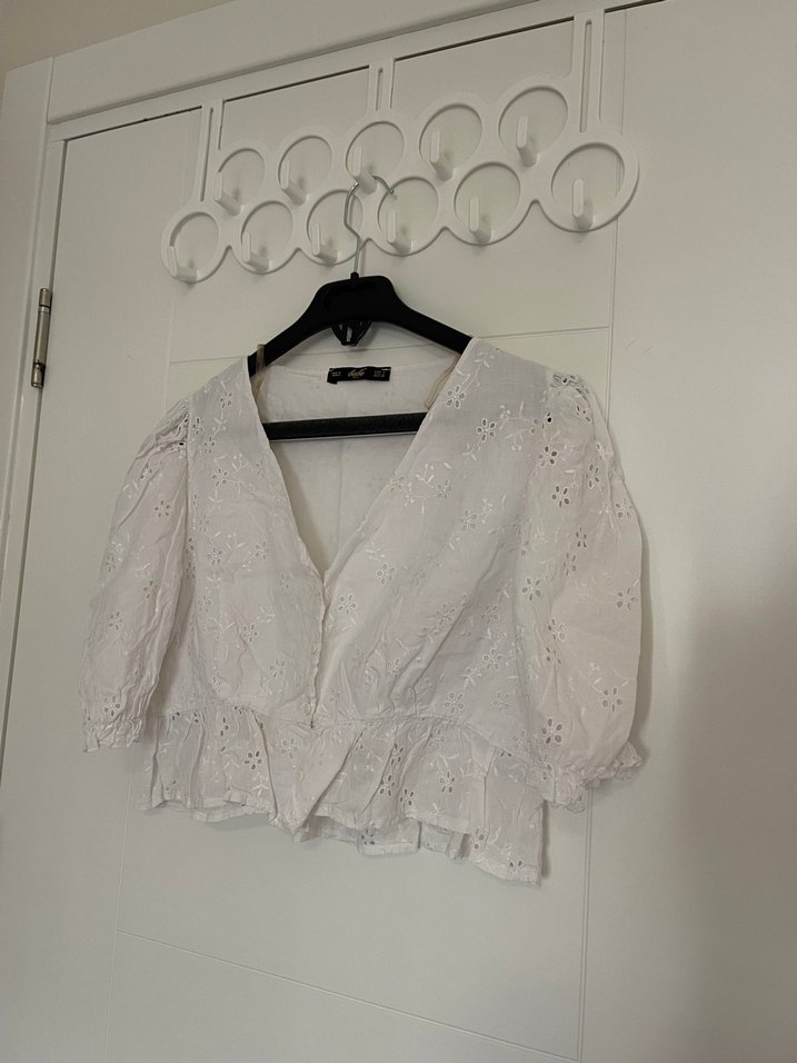 Düğmeli, V yakalı, kısa kollu beyaz keten bluz. Nakışlı desenli ve bol kesim, bohem tarzına uygun.