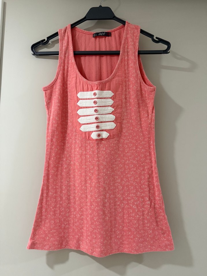 Düğmeli detaylı, V yakalı, pembe renkli, baskılı ve midi uzunlukta, kadınlar için pamuklu dokuma kumaştan üretilmiş atlet. Rahat ve şık günlük sokak stili için uygundur.