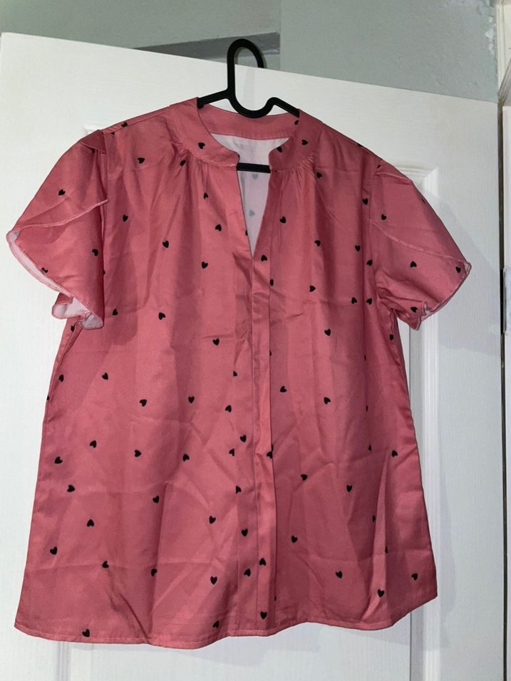 Düğmeli, V yakalı, kısa kollu pembe kadın gömlek. Sentetik kumaştan, bol kesim ve parlak yüzeye sahip, kalp desenli bir tasarım.
