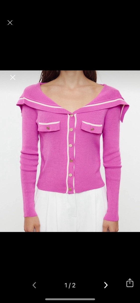 Düğmeli, V yakalı ve uzun kollu pembe triko. İki cep ve denizci yakasıyla günlük kullanıma uygun modern bir tasarım.