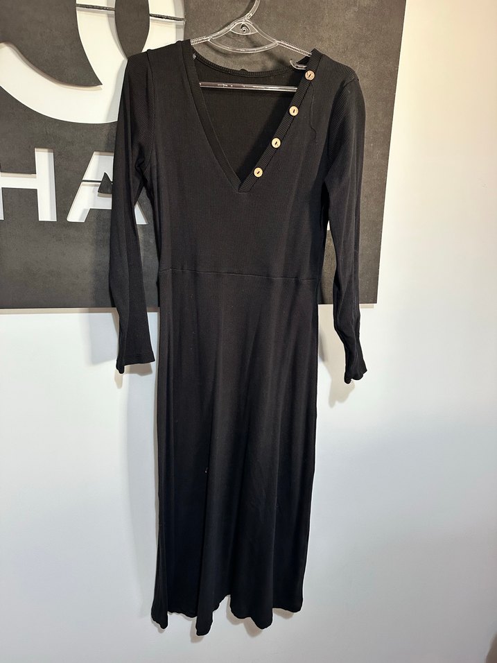 Düğmeli V yakalı, uzun kollu, siyah ve vücuda oturan kadın elbisesi, sentetik kumaştan üretilmiştir ve günlük kullanıma uygundur.