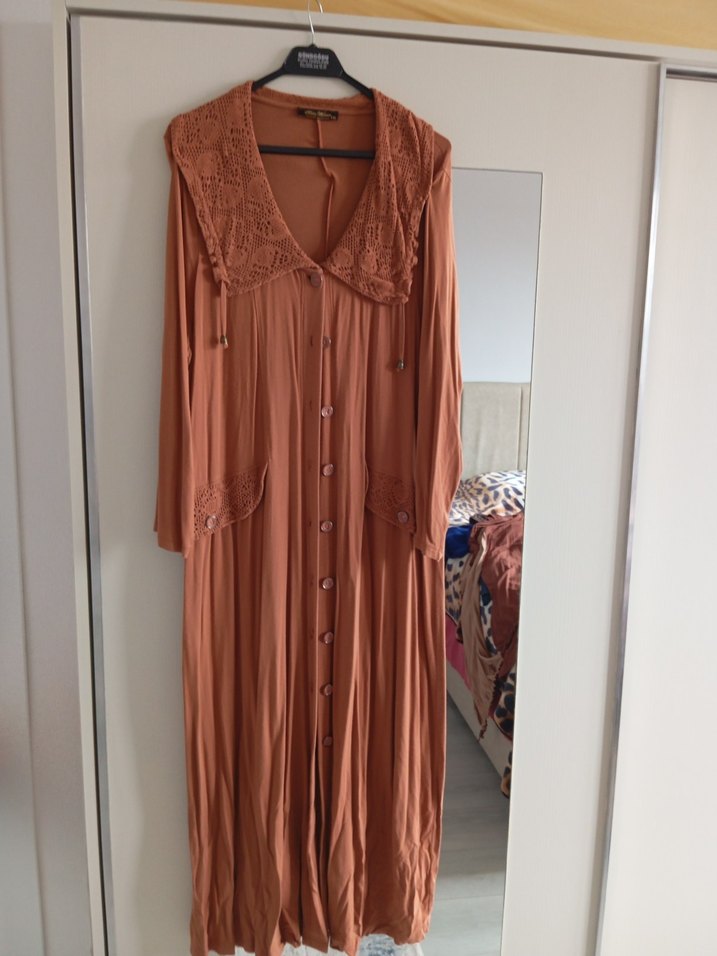 Bej renkli, uzun kollu, V yakalı ve düğmeli bohem tarzda, rahat kesime sahip uzun elbise. Yumuşak triko kumaştan üretilmiştir, günlük kullanıma uygundur.
