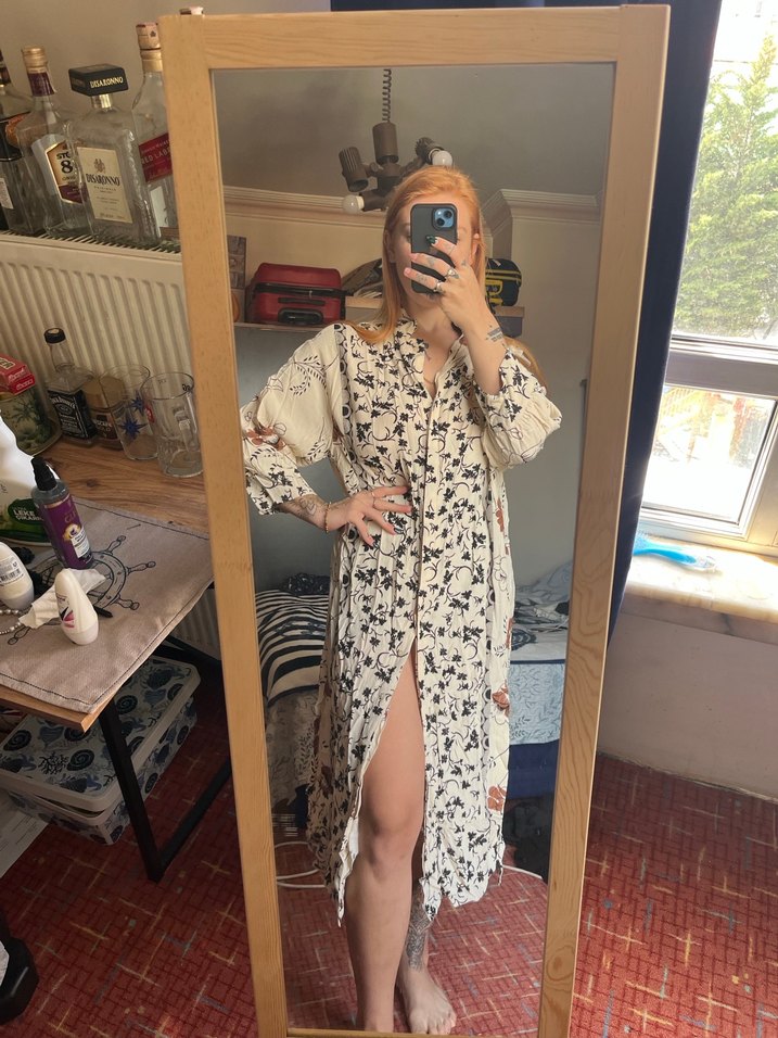 Açık bej renkli, bol kesim uzun elbise. V yaka, uzun kollu ve düğmeli ön detaylı. Günlük kullanım için uygun batik desenli.