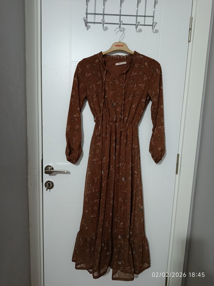 Düğmeli ön kısmı, V yakası ve uzun kollu, bol kesim kahverengi elbise. Sentetik kumaştan, bohem desenli, günlük kullanıma uygun.