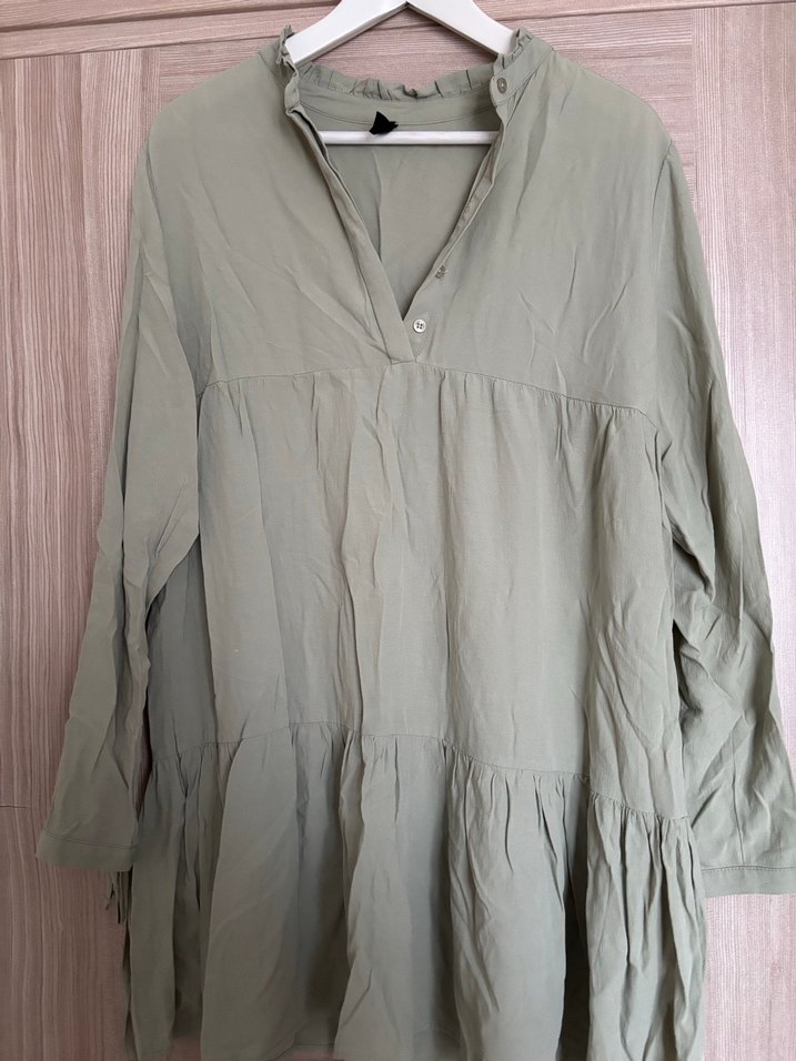Yumuşak keten kumaştan, düğmeli V yakalı, uzun kollu ve bol kesim, bej tonunda günlük bohem tarzda tunik.