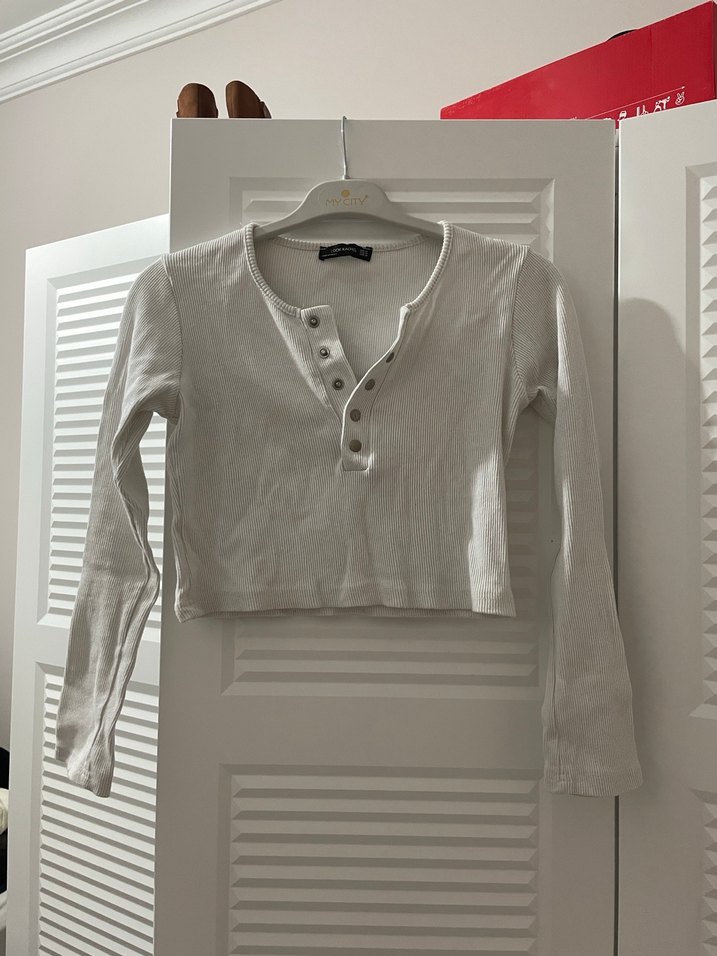 Düğmeli V Yakalı Uzun Kollu Beyaz Bluz