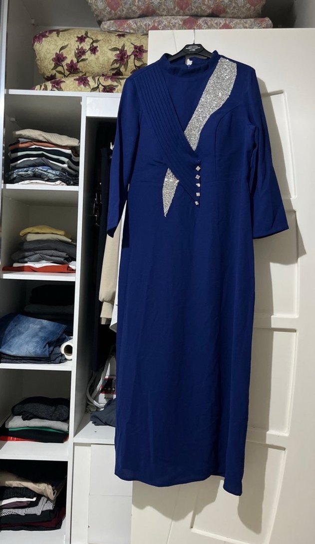 Düğmeli ve V yakalı, uzun kollu lacivert elbise. Minimalist tarzda, günlük kullanıma uygun rahat kesim.44,46bedene uyumludur