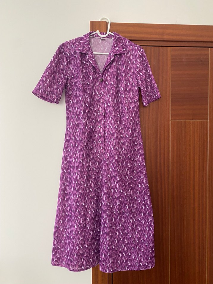 Kısa kollu, V yakalı, düğmeli uzun mor vintage elbise. A kesimiyle rahat bir bohem tarz sunar. Bir düğmesi eksik. Beden etiketi 44 ama m beden birine olur
