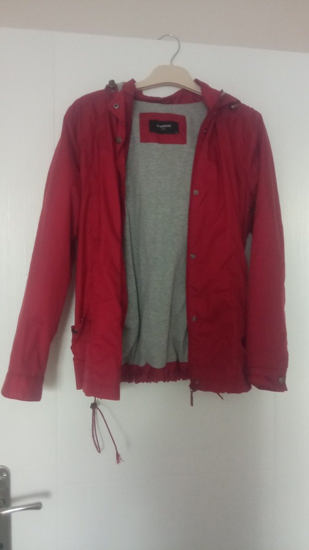 Düğmeli fermuarlı kırmızı midi yağmurluk, bol kesim, uzun kollu ve gri iç astarlı. Sentetik kumaştan üretilmiş, dış mekan kullanımı için uygun. ️