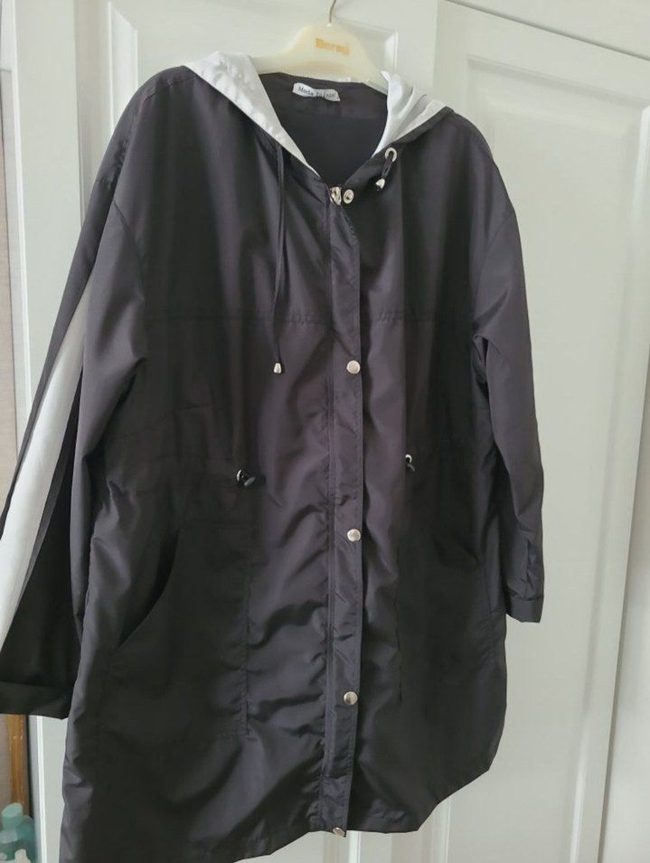 Düğmeli, kapüşonlu siyah midi yağmurluk, notched lapel yaka ve bol kesimle günlük kullanıma uygun sentetik kumaştan üretilmiştir. ☔