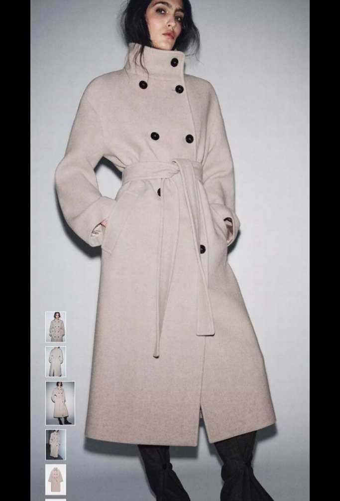 Çift düğmeli ve kemerli bej kaban, yüksek yaka ve yan ceplerle birlikte sıcaklık ve şıklık sağlar. Zara collection kaban sorunsuz m beden sm l uyumlu
