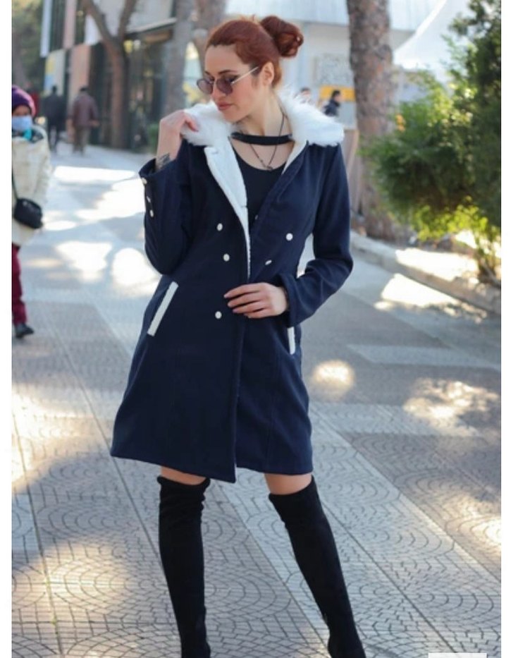 Düğmeli ve peluş detaylı lacivert kaban