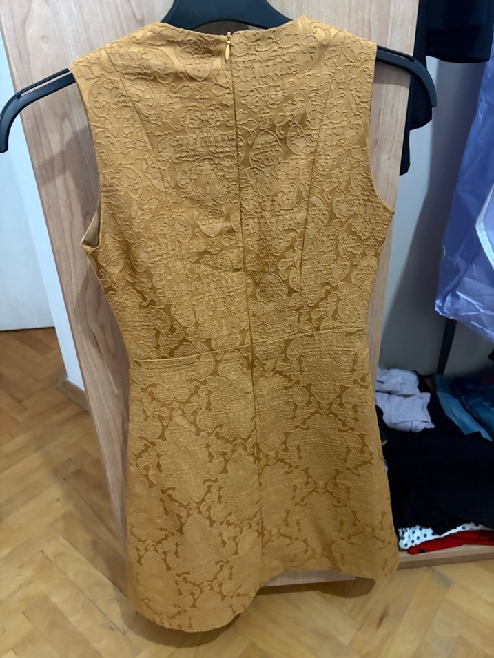 Düğmeli, V yaka, kolsuz bej midi elbise, parlak dokusu ve vintage tarzıyla ofis şıklığı sağlar.