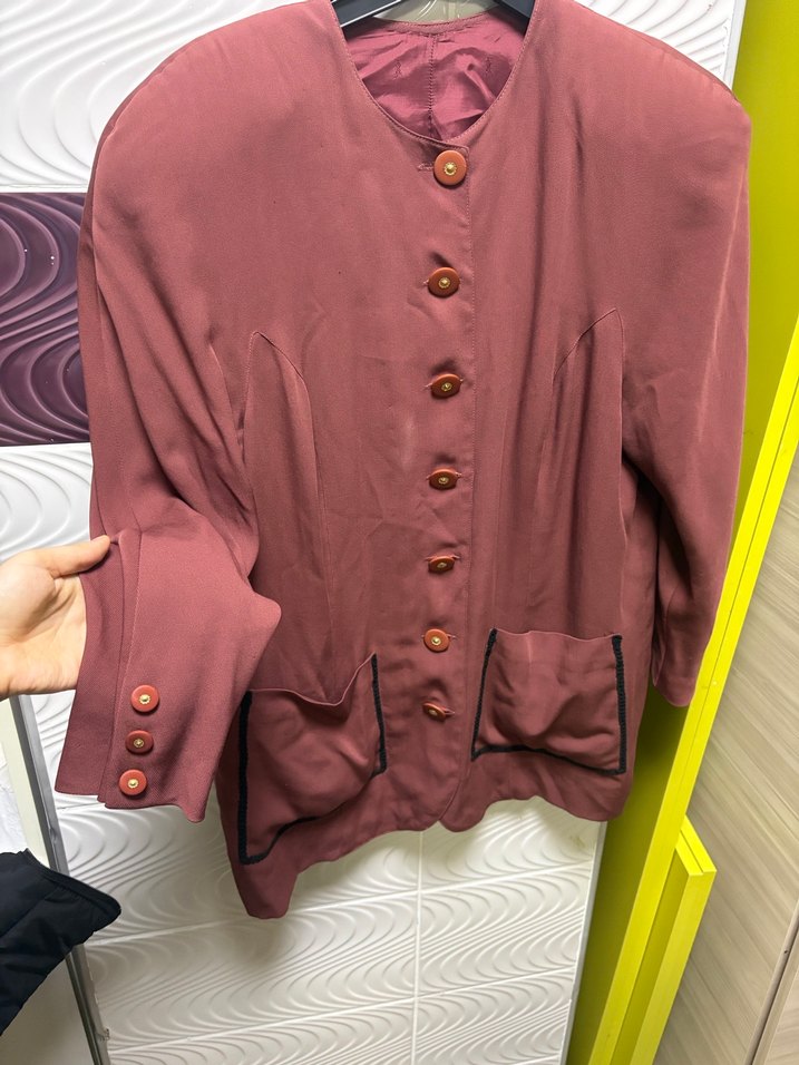 Bordo renkli, düğmeli, yakası kesik, uzun kollu, bol kesim ve midi boy vintage ceket. İki siyah kenarlı ön cebi vardır. Ofis için uygun, vintage sokak tarzı. Ysl astarlı,özel dikim.44-48 beden arasına uygun