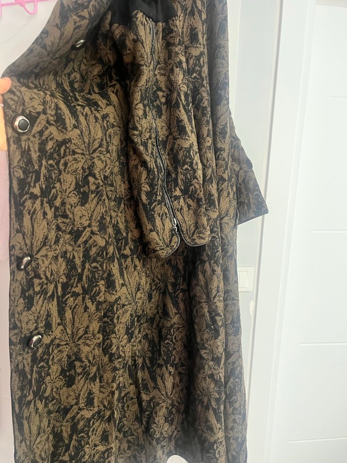 Düğmeli, desenli tekstil kumaştan yapılmış uzun kahverengi hamile bol kesim ve kesik yaka