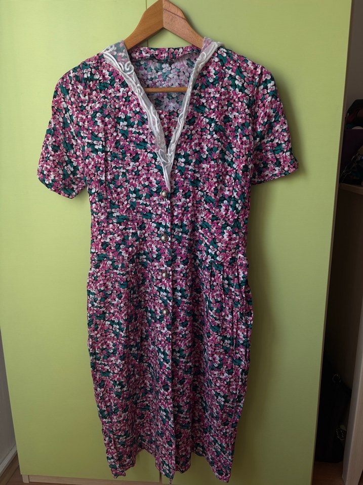 Düğmeli, V yakalı, kısa kollu, bol kesim midi elbise. Renkli batik desenli, bohem ve vintage tarzda, günlük kullanıma uygun. Bana vintage bir mağazadan hediye geldi tarzıma uygun olmadığı için kullanmadım.