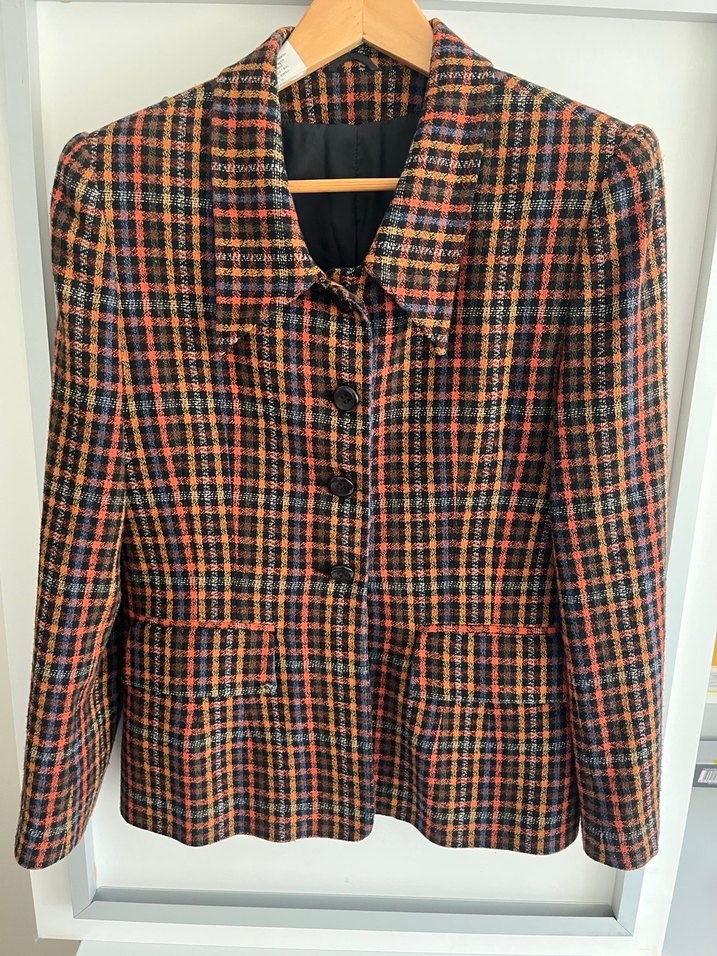 Düğmeli ön ve kesik yaka detaylı vintage tarzda kadın blazer ceket. Yün materyal, regular fit ve uzun kollu, çok renkli kareli desenli, ofis için uygun.iki koltuk altı arası 45 cm İli omuz arası 40 cm, kol uzunluk 60vm, omuzdan eteğe uzunluk 60 cm