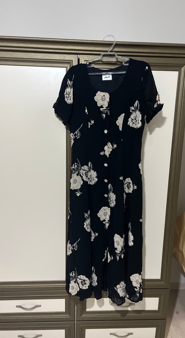 Düğmeli, kısa kollu, V yakalı uzun siyah elbise, çiçek desenli ve bol kesimdir. Yumuşak sentetik kumaştan yapılmıştır, vintage goth tarzındadır.