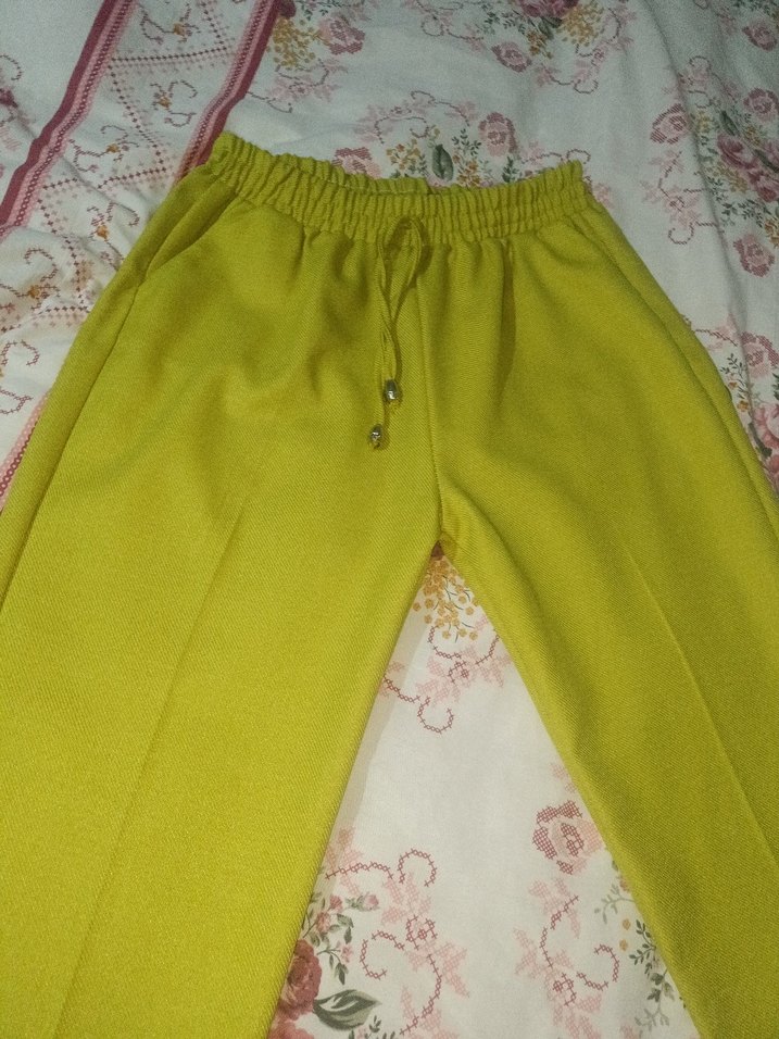 Düğmeli, bol kesim uzun yağ yeşili pantolon. Yumuşak sentetik kumaştan, günlük kullanıma uygun bohem ve rahat bir tarz sunar.