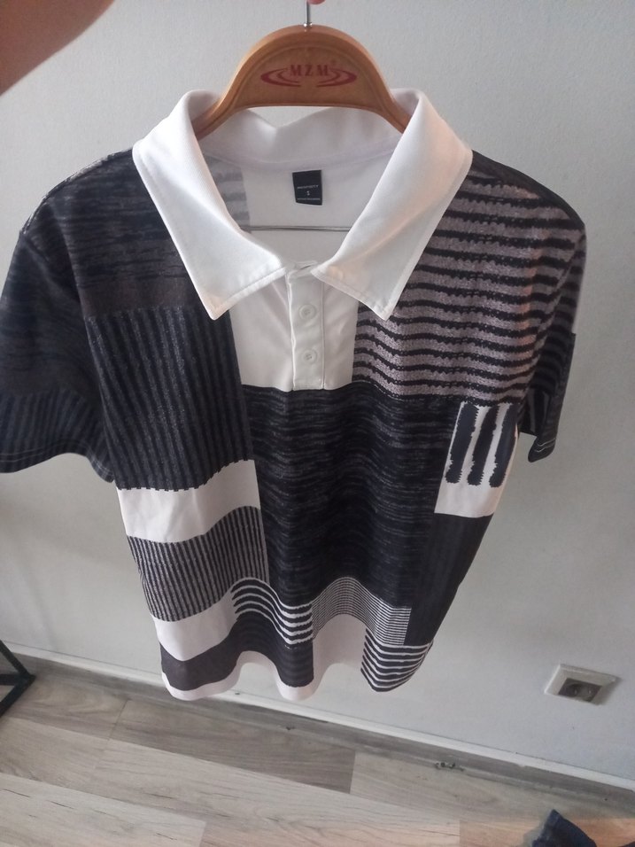 Erkekler için düğmeli yaka, desenli gri beyaz kombinasyonlu, kısa kollu, sentetik kumaştan salaş kesim polo tişört.