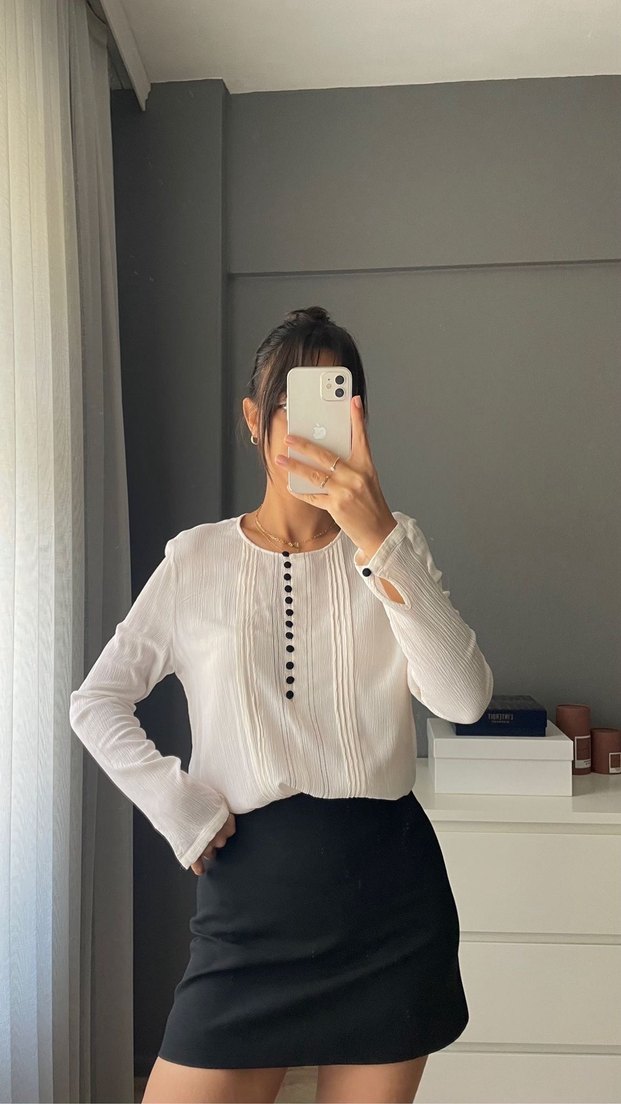Beyaz pamuklu kumaştan, uzun kollu, yüksek yakalı ve düğmeli detaylı, normal kesim ve midi boy kadın ofis bluzu. Kusursuzdur.
