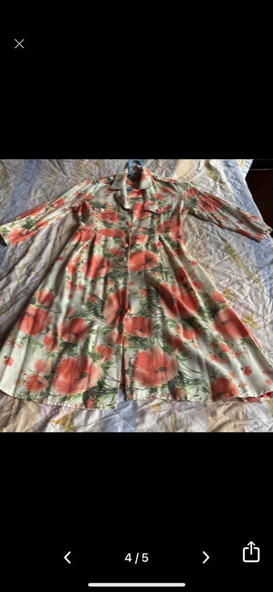 Düğmeli ve yakalı uzun kadın elbisesi. Gevşek kesim, kısa kollu, pastel tonlarda tie-dye çiçek desenli ve keten kumaştan. Bohem tarzda, günlük kullanım için uygun.