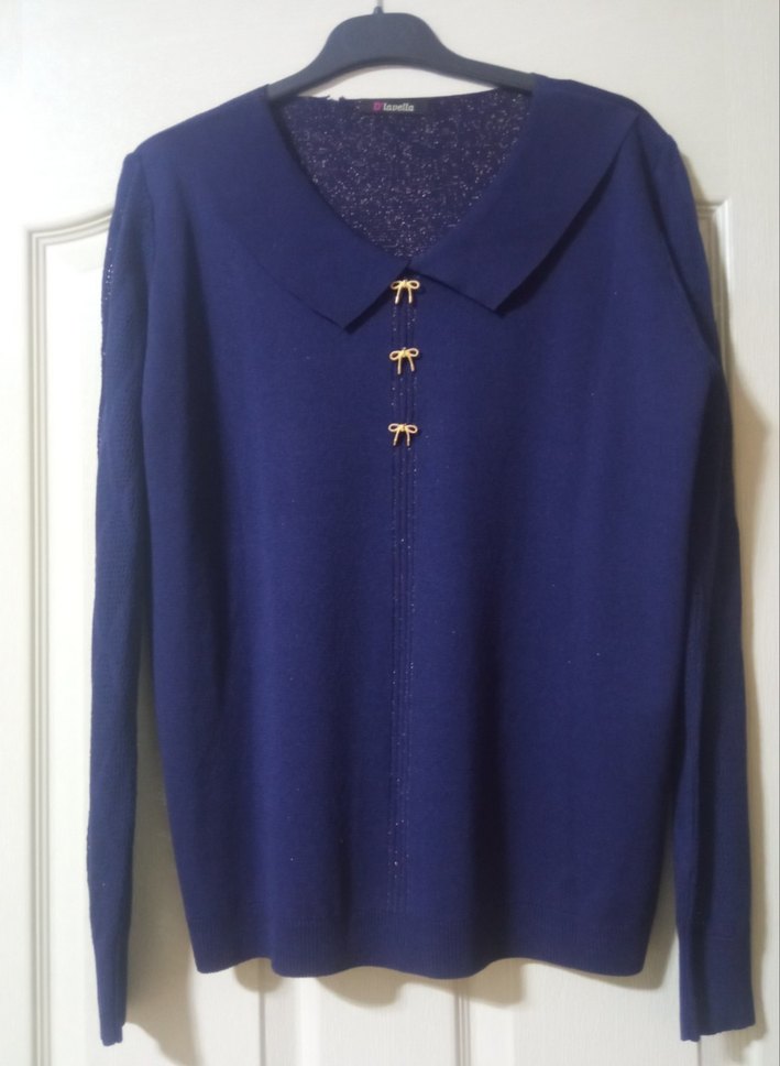 Mavi renkte, düğmeli yakası ve uzun kollu, bol kesim triko kazak. Normal boyu ve parlak görünümüyle günlük kullanıma uygun rahat bir model.