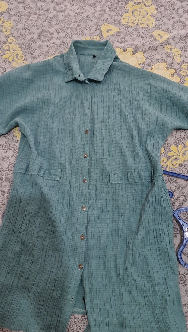 Turkuaz keten gömlek, düğmeli ve yakalıdır. bol kesim ve uzun boyda, bohem tarzı için uygundur. 1 kez kullanıldı
