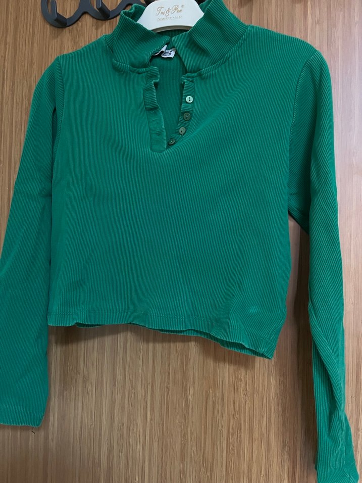 Bu yeşil kadın kazak, düğmeli yüksek yakası ve uzun kollarıyla günlük sokak stiline uygun dar kesimdir.