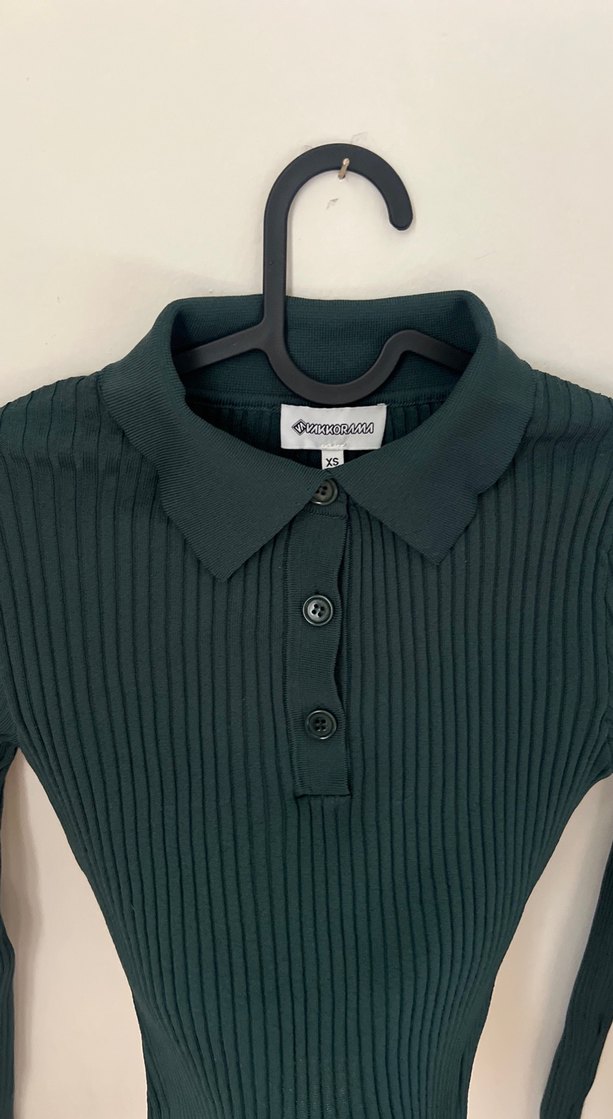 Düğmeli yaka ve uzun kollu, petrol yeşil renkli triko bluz. ofis ve günlük için uygun, rahat ve şık