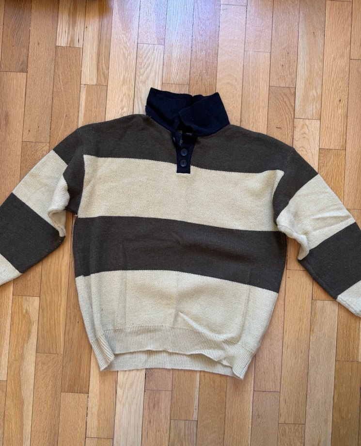 Düğmeli yakalı, uzun kollu, kahverengi ve gri tonlarında yün örgü kadın kazak. Rahat kesimiyle günlük sokak stiline uygundur.
