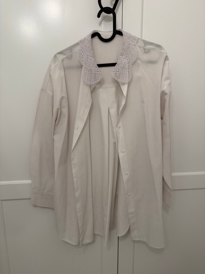 Dantel detaylı yakası, uzun kollu ve düğmeli beyaz keten kadın gömleği, ofis için normcore tarzda rahat kesime sahiptir.