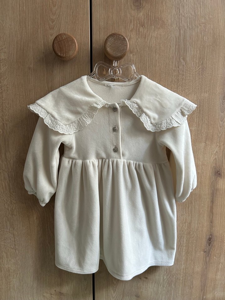 Düğmeli, yakalı ve dantelli detaylı beyaz kız çocuk elbisesi. Uzun kollu, bol kesim ve yumuşak, sıcak kumaştan üretilmiştir, hafif nakışlı. 2 ürün birlikte gönderilecektir