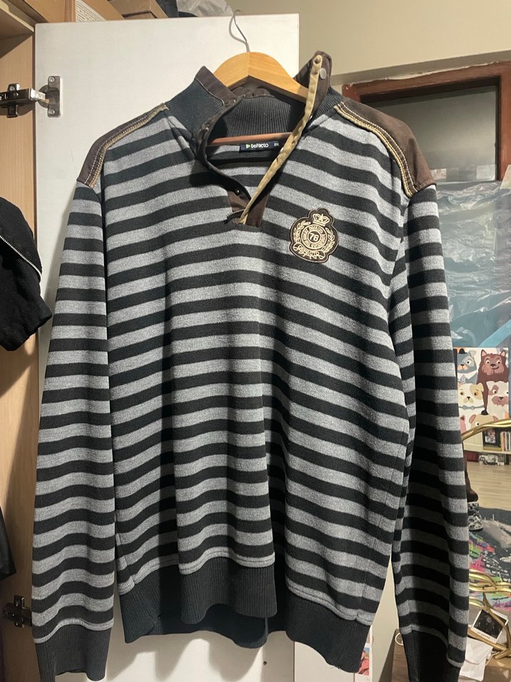 Uzun kollu, düğmeli yakalı, bol kesim gri çizgili erkek kazak. Rahat tekstil malzemeden üretilmiş, günlük kullanıma uygun.