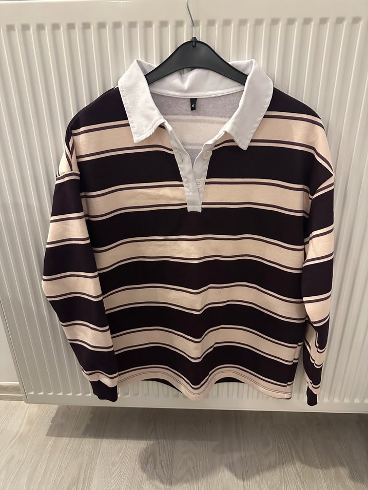 Uzun kollu, düğmeli yakalı, bol kesim kadın kazak. Koyu kahverengi çizgili, midi boyda ve sentetik kumaştan üretilmiştir. Günlük rahat kullanım için uygundur.