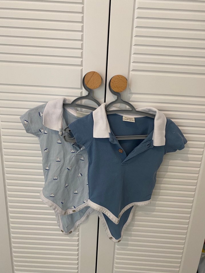 Düğmeli, yakalı ve kısa kollu denim erkek bebek body. Mavi ve gri tonlarda baskılı desene sahiptir.