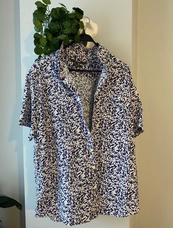 Pamuklu, düğmeli ve yakalı kısa kollu, bol kesim erkek gömlek. Mavi-gri batik desenli, günlük rahat kullanım için uygundur.