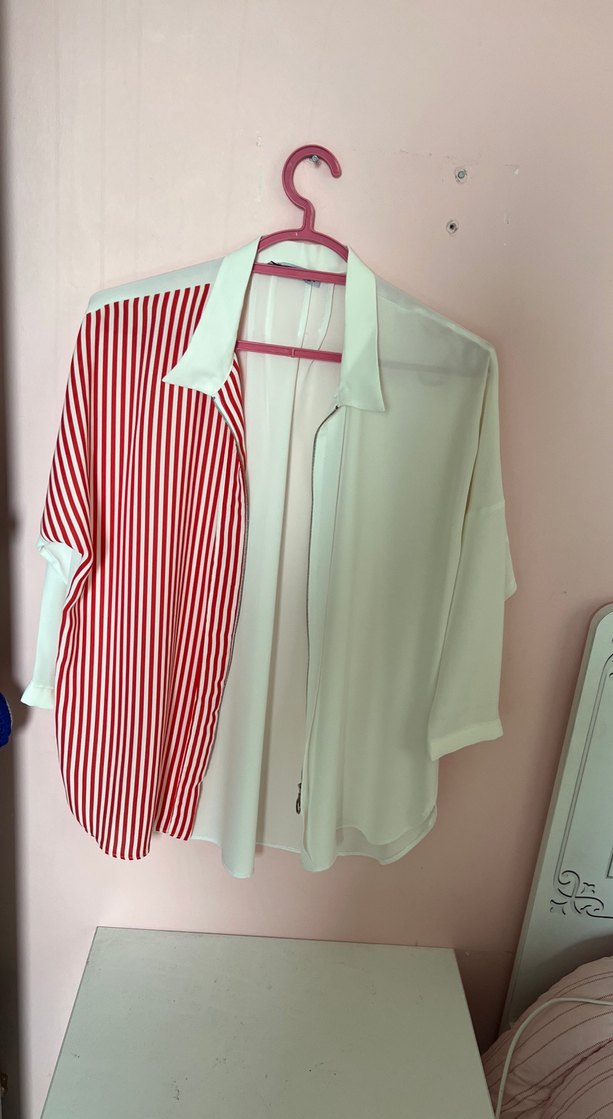 Kadın gömlek, yakalı ve kısa kolludur, bol kesime sahiptir. Düğmeli ön kısmı ve beyaz ile kırmızı çizgili yan tasarımı vardır, yumuşak sentetik kumaştan yapılmıştır. Günlük rahat kullanım için uygundur.