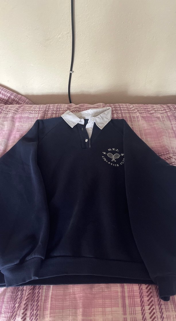 Lacivert kadın sweatshirt, düğmeli yakası ve uzun kollu, bol kesimiyle dikkat çeker. Pamuklu kumaştan üretilmiş, günlük kullanıma uygundur.