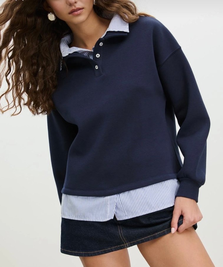 Düğmeli yakalı, uzun kollu ve bol kesim kadın sweatshirtü. Mavi-gri tonlarda denim kumaştan üretilmiş, gündelik sokak stili için ideal.