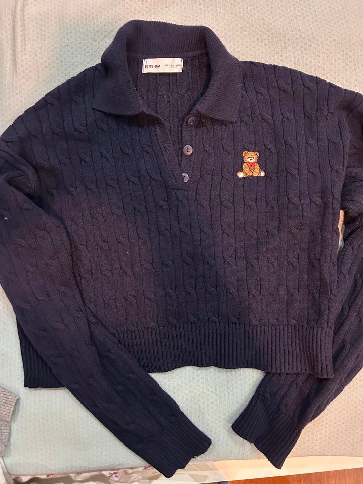Düğmeli yakalı, uzun kollu örgü kadın kazak. Vücuda oturan kesimi ve göğüste nakışlı ayıcık deseni bulunur. Günlük kullanıma uygundur.