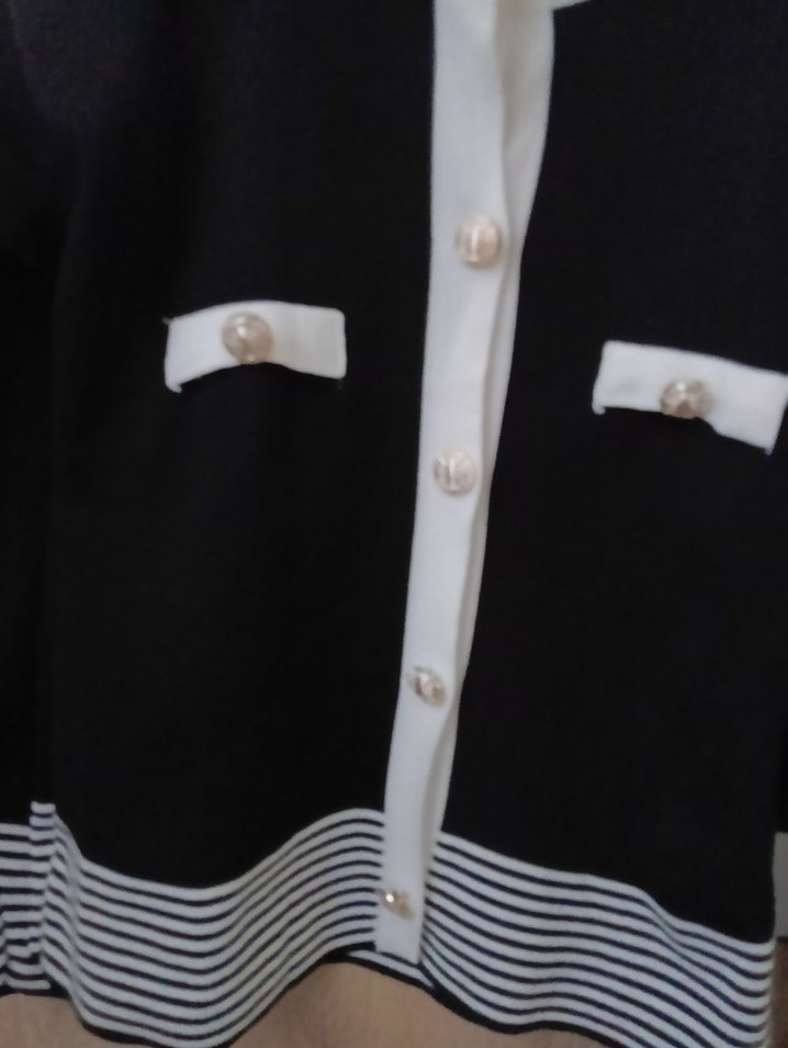 Düğmeli, yakalı, uzun kesim çizgili bluzu. Sentetik kumaştan, gri ve beyaz renklerde, günlük kullanım için uygun.