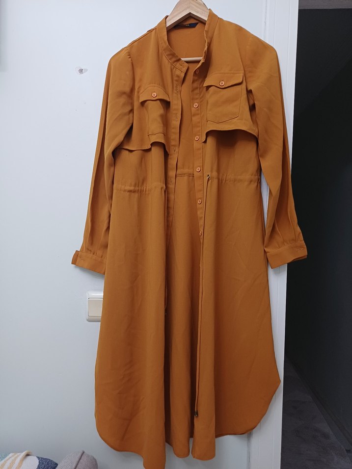 Düğmeli, uzun kollu camel renkli kadın tunik, bol kesim ve kesik yakalıdır. Yumuşak sentetik kumaştan üretilmiştir, günlük kullanıma uygundur. Tuğba marka sayılı kez giyildi