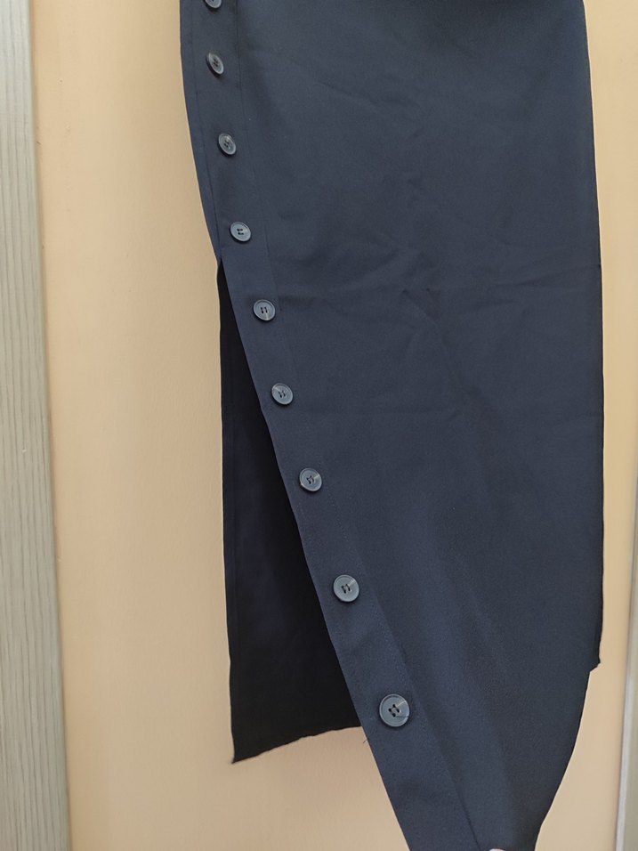 Siyah uzun etek, düğmeli yan detaylı ve rahat kesimdir. Pürüzsüz sentetik kumaştan, minimal ve normcore tarzında, ofis için uygundur.