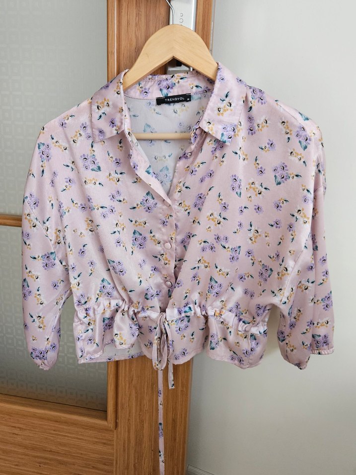 Pembe renkli, düğmeli ve yakalı bu bluz uzun kollu, bol kesim ve midi boydadır. Çiçek desenli ve bel kısmında ayarlanabilir bağcık bulunur. Rahat sentetik kumaştan üretilmiştir.