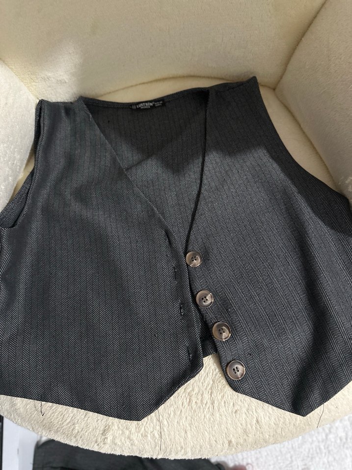 Düğmeli, yakalı ve kolsuz gri kadın yeleği L beden , pantolonu M beden kalıbı güzeldir geniş dar kalıp değil asla