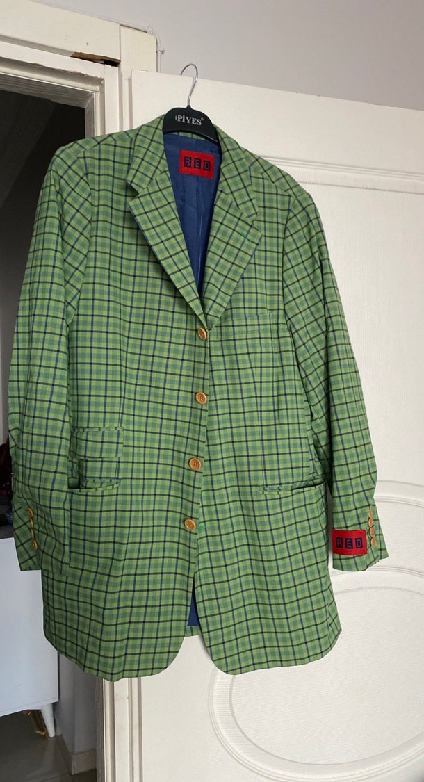 Düğmeli, yeşil kareli kumaştan bayan ceket. Notch yaka, uzun kollu, midi boy, normal kesim, ofis ve sokak stiline uygun.