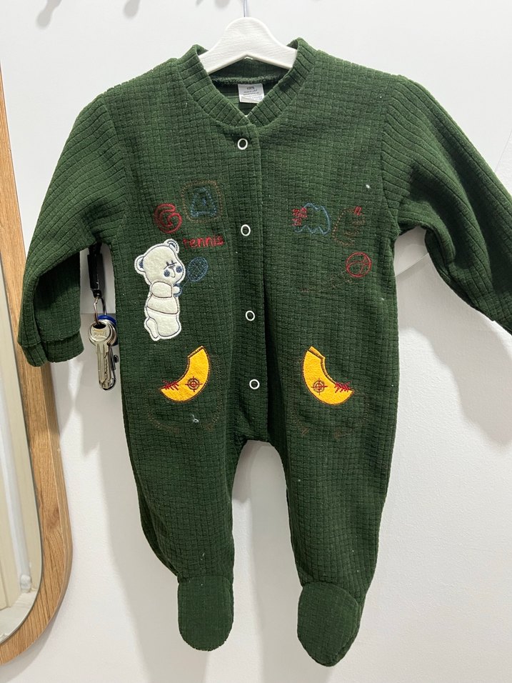 Düğmeli, uzun kollu, yuvarlak yakalı yeşil bebek tulumu, renkli nakış detaylarına sahiptir. Yumuşak ve sıcak kumaştan üretilmiştir.